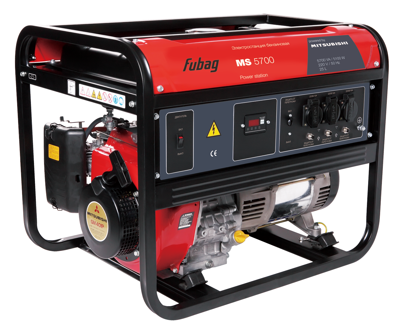 Электростанция оборудована профессиональным двигателем Mitsubishi с верхним расположением клапанов. Номинальная электрическая мощность составляет 5,1 кВт. Запаса мощности у MS 5700 достаточно, чтобы обеспечить питание практически любого электроинструмента, строительного оборудования или садовой техники, а высоконадёжный профессиональный двигатель позволяет работать в течение длительного времени с высокими нагрузками.