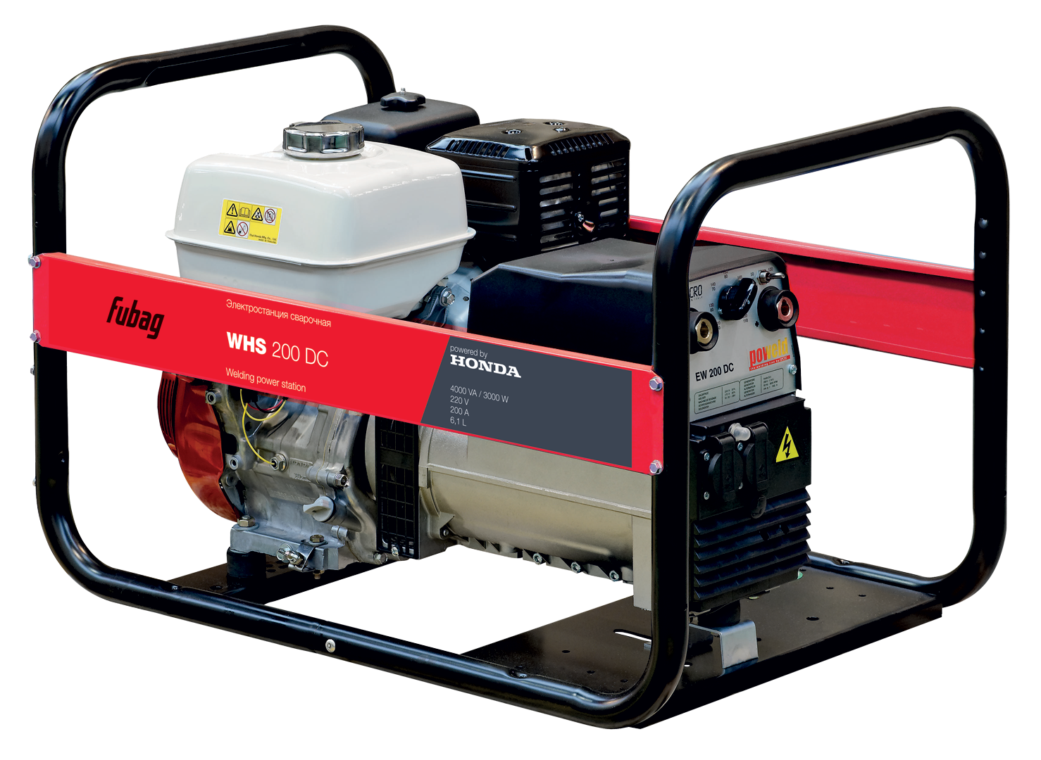 Сварочная электростанция постоянного тока с надёжным и экономичным профессиональным бензиновым двигателем Honda GX OHV. Топливный бак объёмом 6,1 литра позволяет станции работать без остановки в течение 2,4 часа. Рекомендована для строительных и монтажных работ как источник энергии и для проведения сварки.