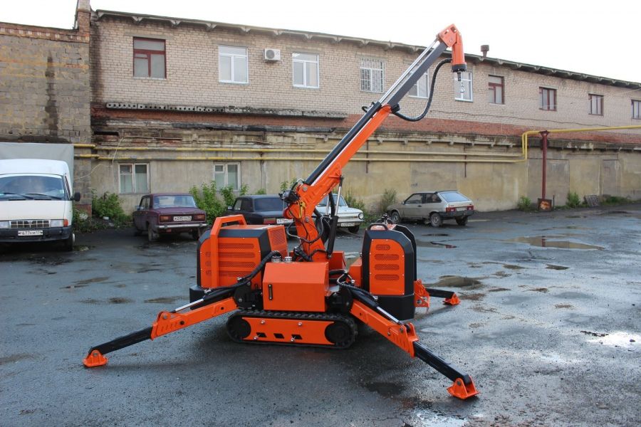 Самоходная гусеничная платформа универсальной машины оборудована телескопической двухсекционной стрелой, с радиусом разворота не менее 1400 см и мощностью привода 24 л. с.